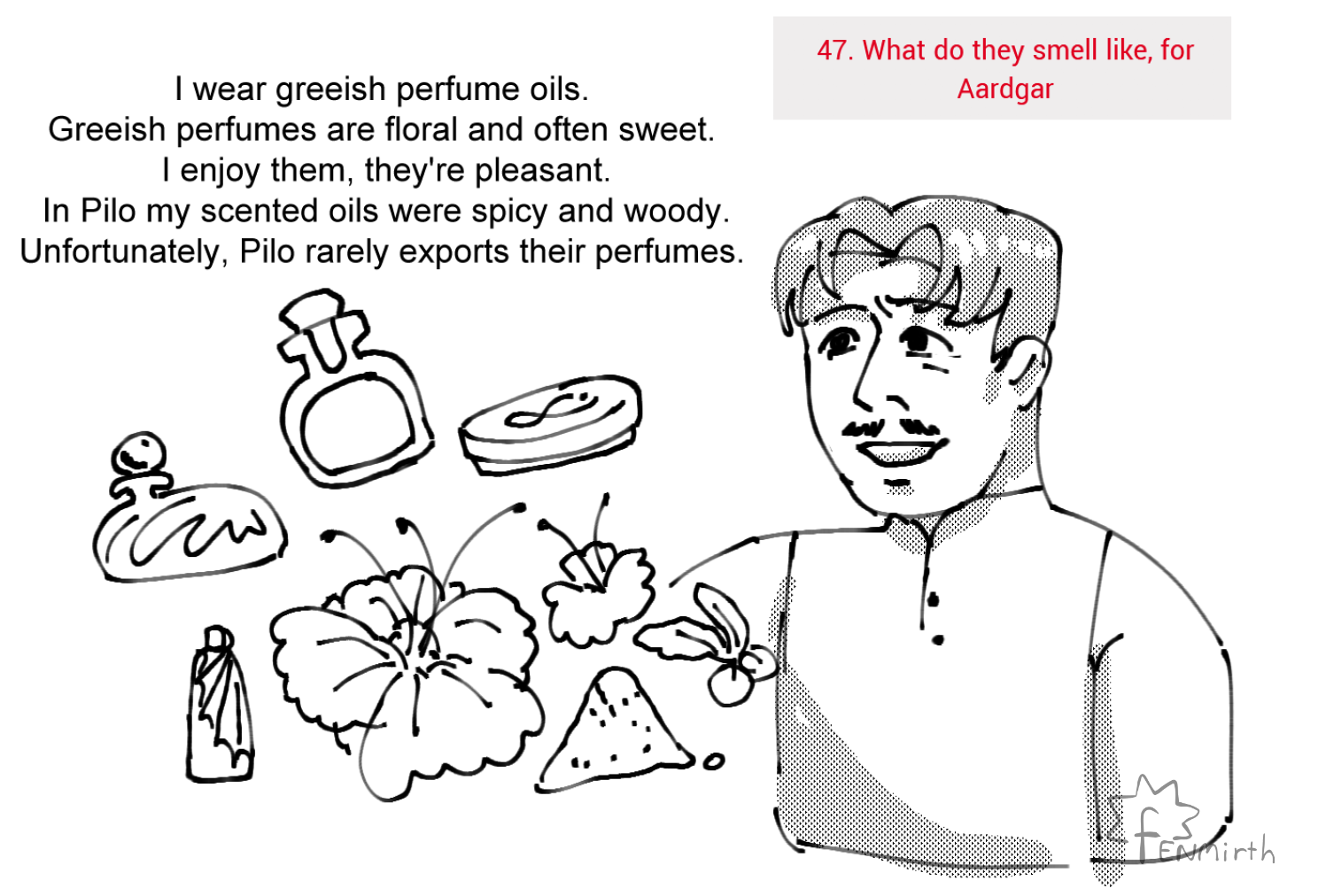 Aardgar: I wear Greeish perfume oils. Greeish perfumes are floral and often sweet. I enjoy them, they're pleasant. In Pilo my scented oils were spicy and woody. Unfortunately, Pilo rarely exports their perfumes.